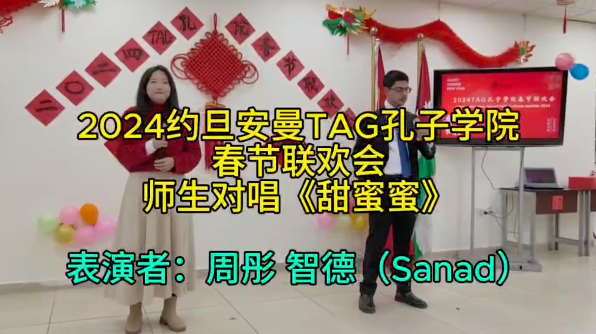 在安曼TAG孔子学院的文化活动中,师生共同带来了一场温馨动人的对唱表演《甜蜜蜜》。以经典中文歌曲为载体,用师生默契的配合与真挚的歌声,传递跨文化交流的温暖,也展现出中文学习过程中师生相伴的美好情谊。